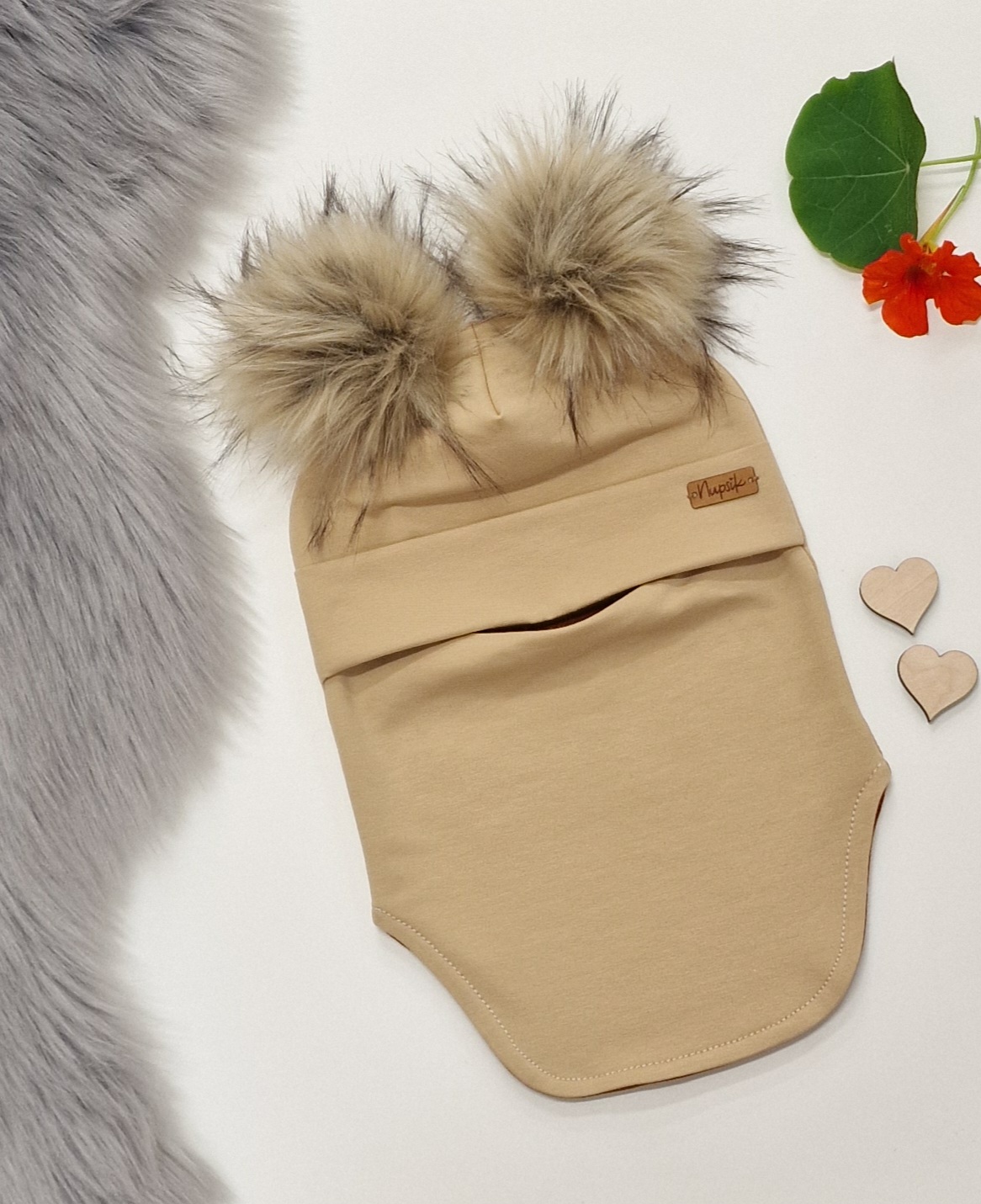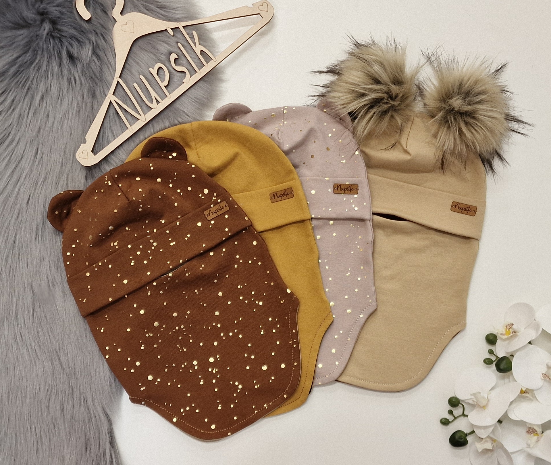 Mütsitutid väikesed 2tk ja Suur mütsitutt keskele – Kõik mütsitutid on kunstkarusnahast ( 100% polüester) ja valmistame neid ise käsitsi ning sobitame suuruselt ja värvilt vastavalt mütsi suurusele ning kangale, et tulemus jääks ilus. Mütsituttidega mütse võib pesumasinas pesta, kuid nagu kõigi kangaste puhul, mida madalamad temperatuurid ja väiksemad pöörded, seda kauem kestab.