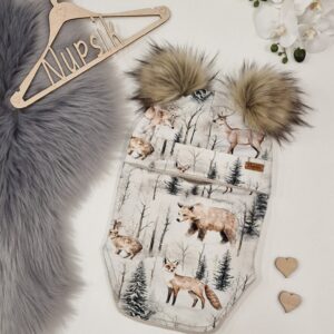 Mütsitutid väikesed 2tk ja Suur mütsitutt keskele – Kõik mütsitutid on kunstkarusnahast ( 100% polüester) ja valmistame neid ise käsitsi ning sobitame suuruselt ja värvilt vastavalt mütsi suurusele ning kangale, et tulemus jääks ilus. Mütsituttidega mütse võib pesumasinas pesta, kuid nagu kõigi kangaste puhul, mida madalamad temperatuurid ja väiksemad pöörded, seda kauem kestab. Peale pesu võib kammida mütsitutid läbi taas kohevaks.